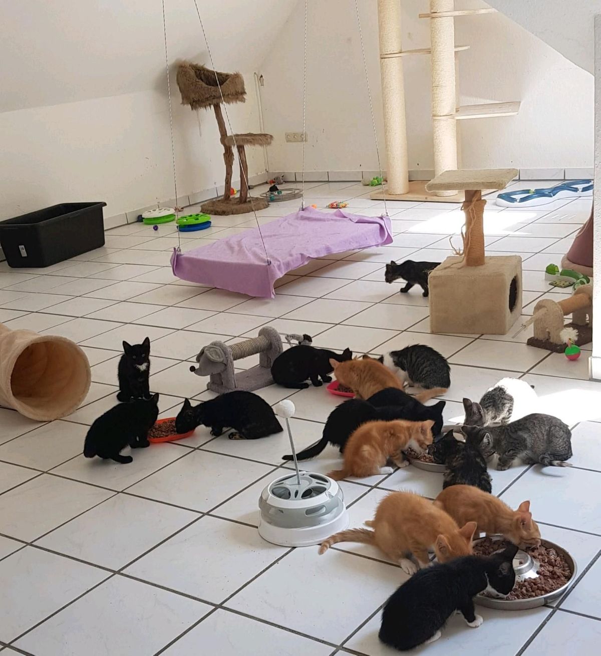 In diesem Jahr ist es wieder besonders schlimm. 40 Kitten wurden teilweise bei uns geboren oder fanden auf anderem Wege zu uns. Einige mussten tierärztlich behandelt werden oder werden es noch. Nun sind sie soweit und fressen alle eigenständig. Glaubt uns – sie fressen viel und das Spielzeug, Kuschelhöhlen, etc. sind schnell defekt.
