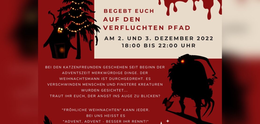 Am 02. und 03.12.2022 zwischen 18:00 bis 22:00 Uhr öffnen wir die Tore für Euch in der Hoffnung, dass ihr uns rettet! 😱Bei uns geschehen seit Beginn der Adventszeit merkwürdige Dinge. Der Weihnachtsmann 🎅🏻 ist durchgedreht. Es verschwinden Menschen und finstere Kreaturen 🧌wurden gesichtet… Traut ihr Euch, der Angst ins Auge 👁️ zu blicken? Lasst uns damit nicht alleine!!!! “ Fröhliche Weihnachten“ 🎄 kann jeder.