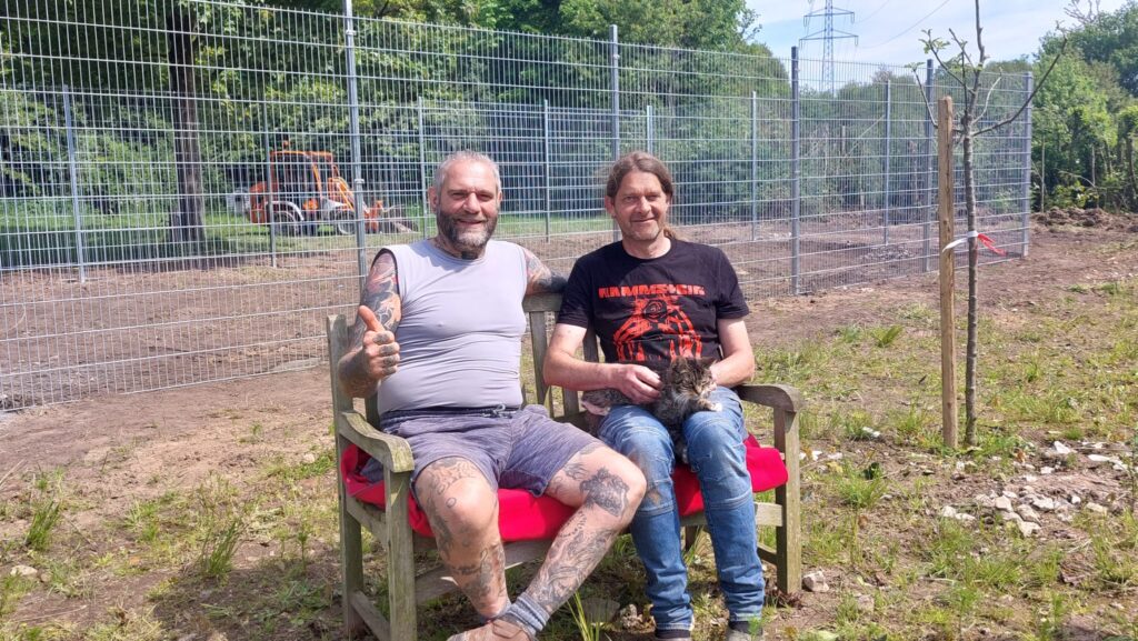 Übrigens habe ich ein Foto mit dem Chef von den Männern („Harte Hunde“) auf einer Bank vor dem neuen Gehege. Meine Zweibeiner meinen, daß mich viele Frauchen darum beneiden. Warum ?? Verstehe ich nicht. Der ist einfach nur nett. Wichtig ist doch jetzt nur, daß draußen alles fertig wird. Viele meiner Kumpel wollen endlich raus.