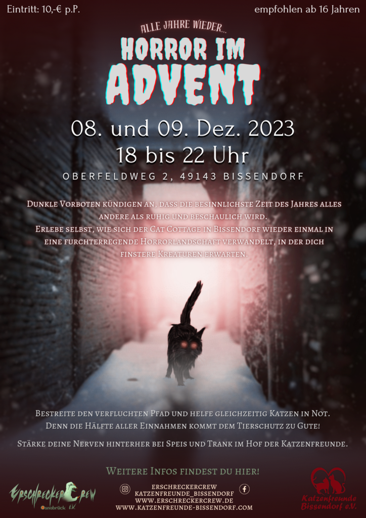 Wie immer heißt es bei uns, nach dem Event ist vor dem Event. Wir eröffnen natürlich nochmals in diesem Jahr die Pforten auf dem Cat Cottage der Tierschutzstiftung Netzwerk für Tiere. Die Erschrecker Crew Osnabrück e.V. möchte wie im letzten Jahr euch das Gruseln zum Advent beibringen!! Wer denkt, er sei mutig…. wird vielleicht doch eines Besseren belehrt!! 🎅🏻🎄🧌