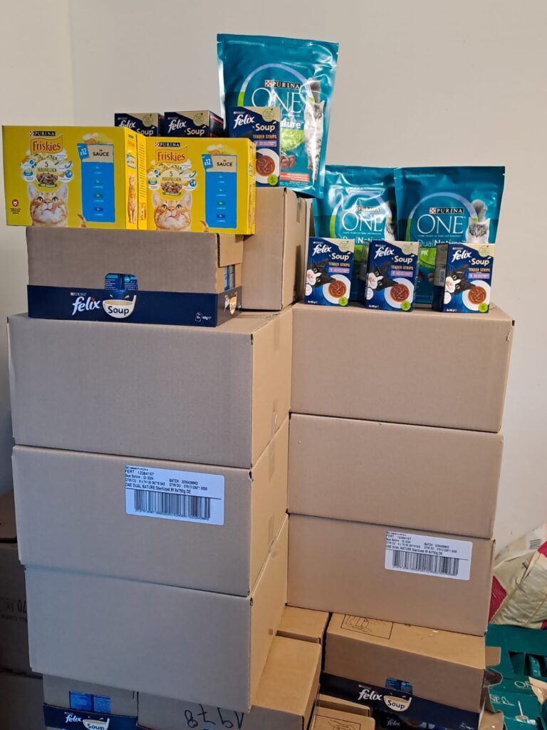 Gold wert ist es aber auch, wenn so große Unternehmen wie Purina uns mit Futter für unsere Schützlinge unterstützen. Das hilft uns immer über eine gewisse Zeit weg und unsere Tiere lieben es. Es kam wieder eine ganz Palette nur für uns an. Unsere Tiere lieben es und da der Winter bald kommt, fressen die Tiere besonders Draußen momentan viel mehr. Nochmals ein dickes Dankeschön an die Firma Purina, die uns immer wieder mit Futter unterstützen!!!! Es ist immer eine Sorge weniger. Gerade in der momentanen Lage, wo Fundkatze quasi an jeder Ecke gefunden werden und das Haus sowie auch das Außengehege immer voll ist.