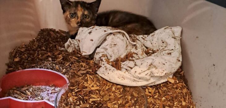 So wurde uns die Katze von einem Bauhof einer nahegelegenen Gemeinde übergeben. Die Katze sollte das ganze Wochenende über in dieser Box mit Rindenmulch verharren, aber für Wasser und Futter wäre gesorgt wie man sehen kann. Alle Vereine sind mehr als voll und wissen auch schon nicht mehr wohin, aber sowas ist ein absolutes No-Go und überhaupt nicht tragbar.